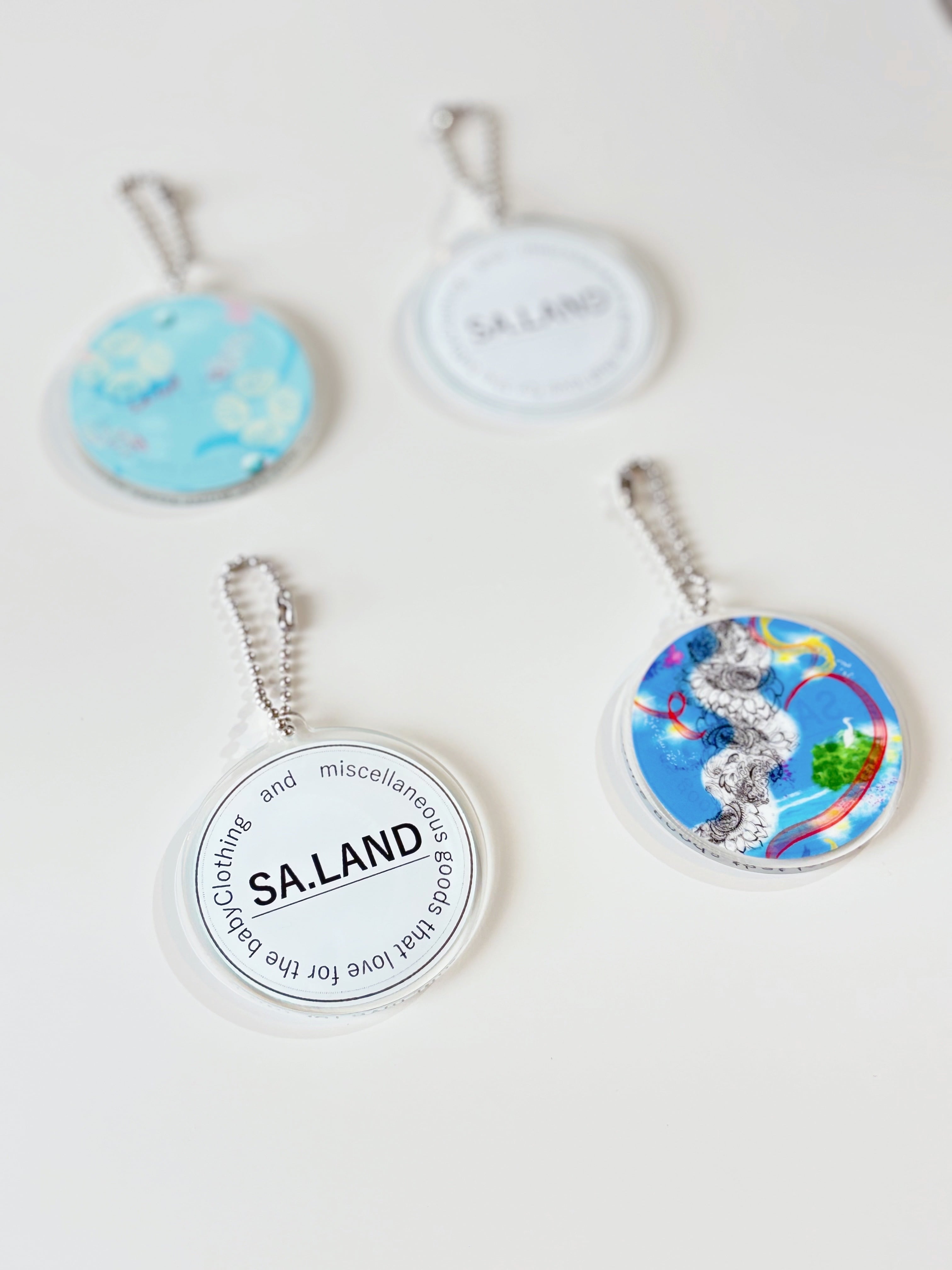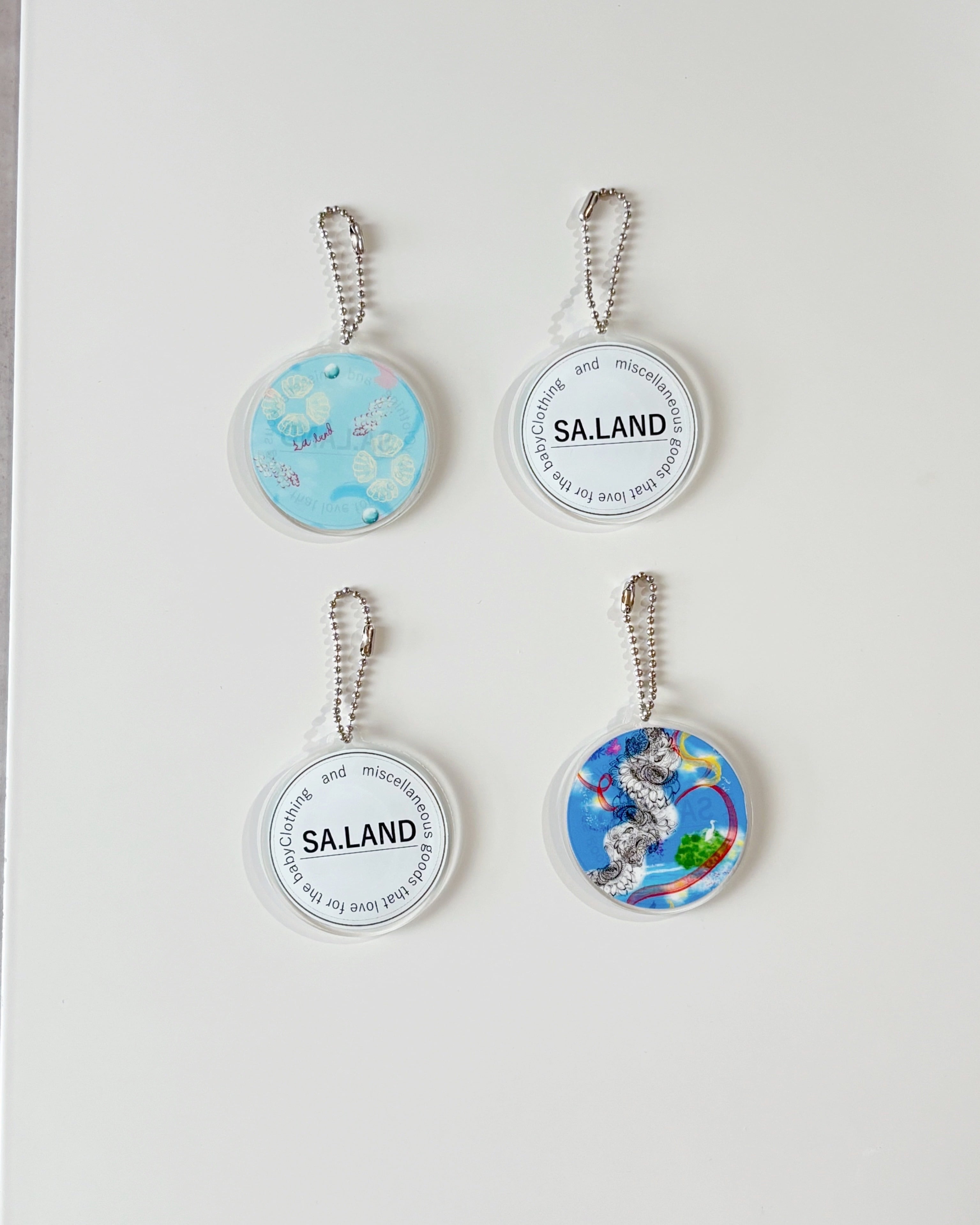 SA.LANDのブランドロゴと宮古島をイメージしたオリジナル柄が施されたアクリルキーホルダーチャームが新発売!持ち運びやすい軽量デザインで、カギやバッグのアクセサリーとしての用途はもちろん、このチャーム一つでおしゃれ度がアップします。